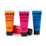 The Neon festival face paints glow under UV light (Ultraviolet Light or Backlight). The vegan and paraben-free formula are waterproof after application so will not run with sweat. Available in 6 intense UV neon shades.